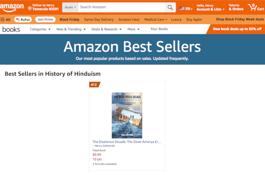 November 22, 2025: Henry’s recently-published book of Hare Krishna history, The Disastrous Decade, made it to number 12 in “Amazon Top 100 Best Sellers in History of Hinduism” list. Henry explained, “I’m grateful to my readers who appreciate my books, and purchase them. Thank you! I am in your debt.”