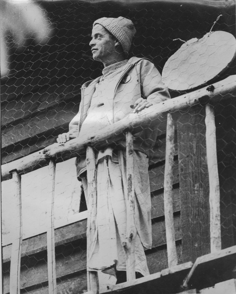 Kirtanananda Swami on the front porch of his Bahulaban cabin (c. 1978)