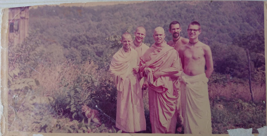 Kirtanananda Swami, Vamanadev, Hrishikesh (Harold Olstead), Hayagriva and Pradyumna (Paul H. Sherbow) at New Vrindaban (summer 1968).