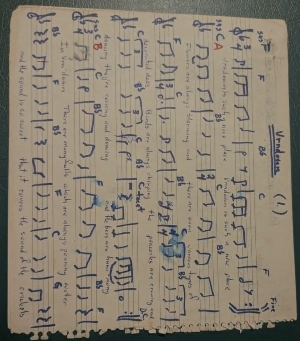 Manuscript score for “Vrindaban Is Such a Nice Place” by Hrishikesh dasa. To listen, go to YouTube.