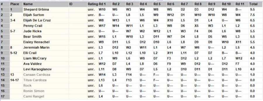 Final Standings for Mr. Doktorski’s Fall 2025 Chess4Kidz class at Gather & Grow Homeschool Cooperative.