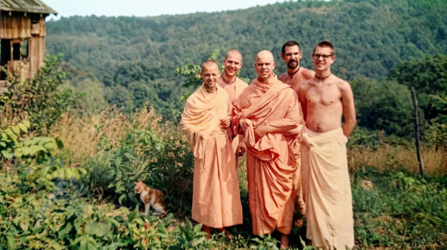 Kirtanananda Swami, Vamanadev, Hrishikesh (Harold Olstead), Hayagriva and Pradyumna (Paul H. Sherbow) at New Vrindaban (summer 1968). We think that is Ranadhir’s cat. Perhaps Ranadhir is taking the photo.