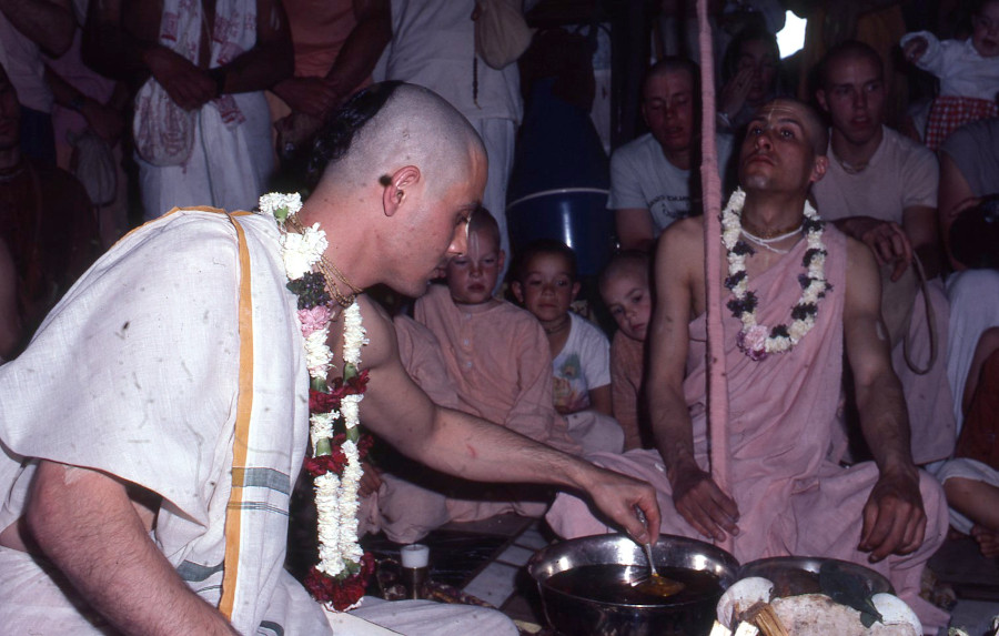 Kuladri (Arthur Villa) presides over a New Vrindaban fire sacrifice (1984).