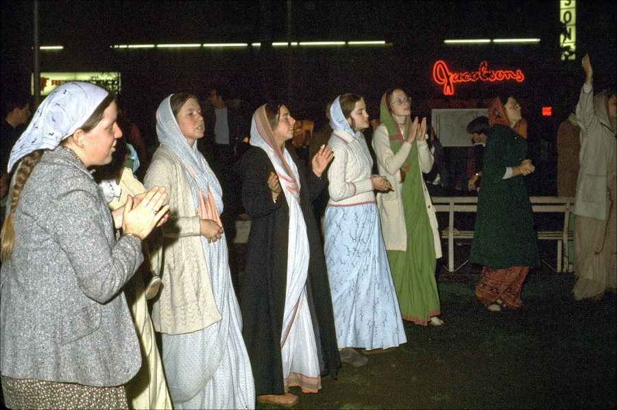 Women of San Diego ISKCON, ca. mid-1970s, chanting on the street. Ragamathani is wearing blue sari and sweater with pink edge. From a collection of photos on the Facebook page of Abhinanda Das.