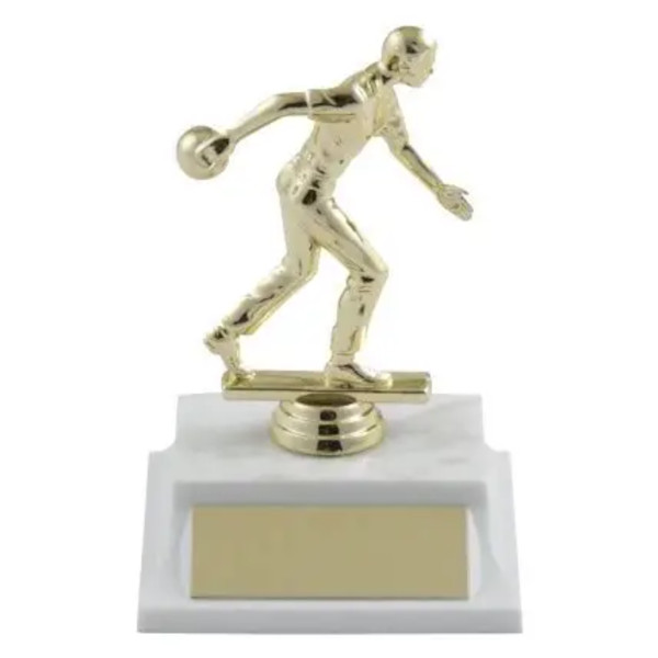 After all the games were done, all of us students got lined up, and we went to the principal who gave each of us a trophy. It was about six inches tall. Small white marble base. A golden-plated statue of a man bowling and an inscription in the base, I don’t remember what.