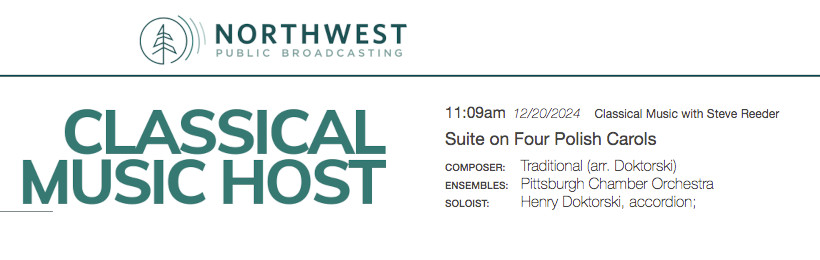 Henry said: “I’m pleased my Suite on Four Polish Carols appear to be favorites on the radio waves. Who knows how many other radio stations broadcast tracks from my Christmas CD? In 1993 I mailed out 400 copies to classical radio stations in the U. S. and Cananda. Today, I can only tell if they’re playing my music if the stations put their broadcast logs online, such as these three stations.”