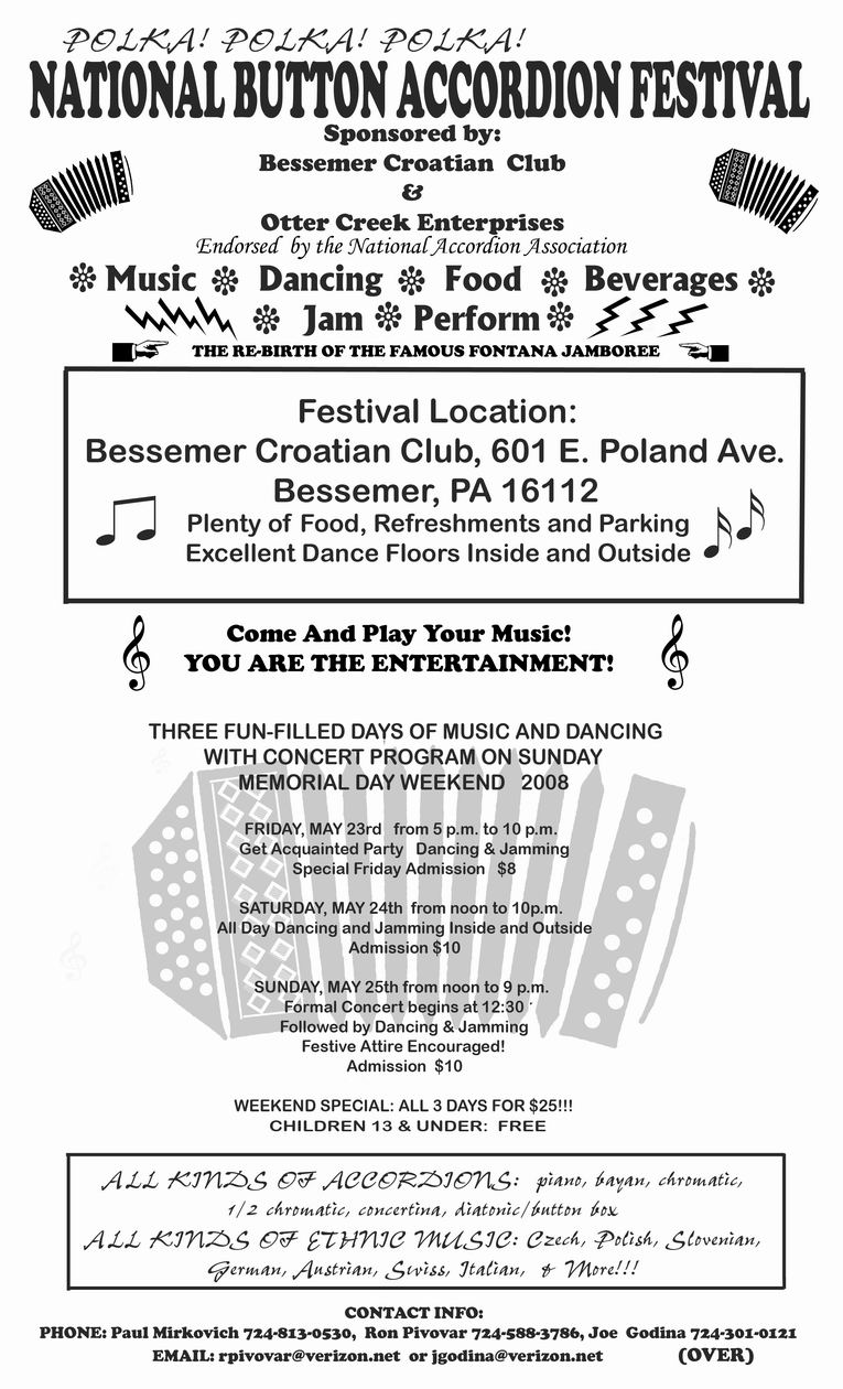 May 23, 2008: Henry Doktorski played a brief solo at the National Button Accordion Festival held at the Croatian Club in Bessemer, Pennsylvania. He played his Theme and Variation on Richard Rodgers' Edelweiss on the main stage, and then performed a few pieces by Guido Deiro offstage for friends. Doktorski explained: "I wasn't expecting to play anything at the festival. I was there just to listen to some good music and have a good time. My student and friend, David Masterpietro of Ellwood City, Pennsylvania, is a member of the Croatian Club in Bessemer. When he heard about the button-accordion festival, he invited me to dinner at the club with his wife and then to listen to the musicians and bands. I thought it would be great fun, and it was. We didn't dress up for a formal occasion since it was a casual affair, and I hoped to just sit back and enjoy some fine music."